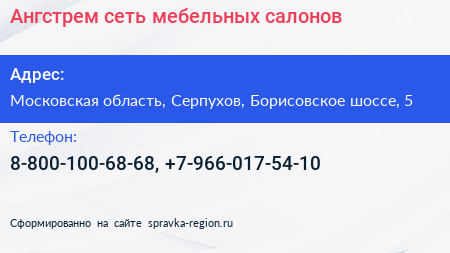 Ангстрем, сеть мебельных салонов по адресу Московская область, Серпухов, Борисовское шоссе, 5 в дальнейшем Организация, размещена в следующих категориях: