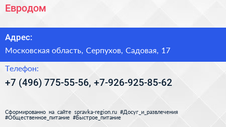 Евродом по адресу Московская область, Серпухов, Садовая, 17 в дальнейшем Организация, размещена в следующих категориях: