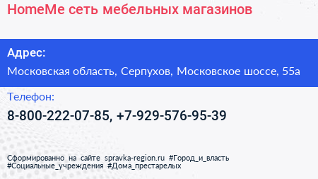 HomeMe, сеть мебельных магазинов по адресу Московская область, Серпухов, Московское шоссе, 55а в дальнейшем Организация, размещена в следующих категориях:
