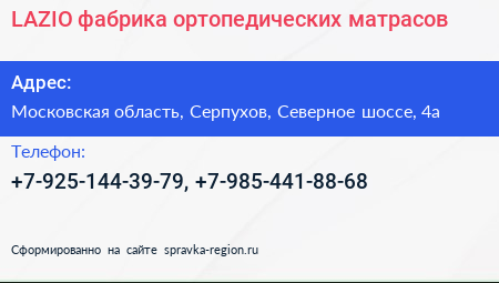 LAZIO, фабрика ортопедических матрасов по адресу Московская область, Серпухов, Северное шоссе, 4а в дальнейшем Организация, размещена в следующих категориях: