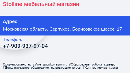 Stolline, мебельный магазин по адресу Московская область, Серпухов, Борисовское шоссе, 17 в дальнейшем Организация, размещена в следующих категориях: