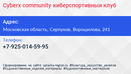 Cyberx community, киберспортивный клуб по адресу Московская область, Серпухов, Ворошилова, 241 в дальнейшем Организация, размещена в следующих категориях: