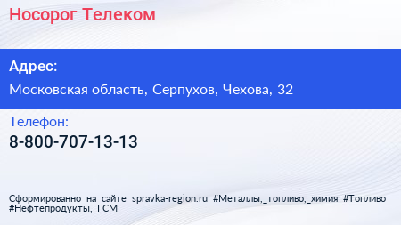 Носорог-Телеком по адресу Московская область, Серпухов, Чехова, 32 в дальнейшем Организация, размещена в следующих категориях: