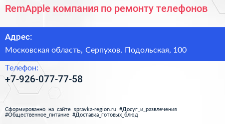 RemApple, компания по ремонту телефонов по адресу Московская область, Серпухов, Подольская, 100 в дальнейшем Организация, размещена в следующих категориях: