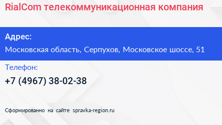 RialCom, телекоммуникационная компания по адресу Московская область, Серпухов, Московское шоссе, 51 в дальнейшем Организация, размещена в следующих категориях: