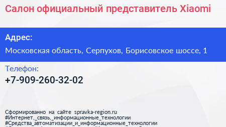 Салон, официальный представитель Xiaomi по адресу Московская область, Серпухов, Борисовское шоссе, 1 в дальнейшем Организация, размещена в следующих категориях: