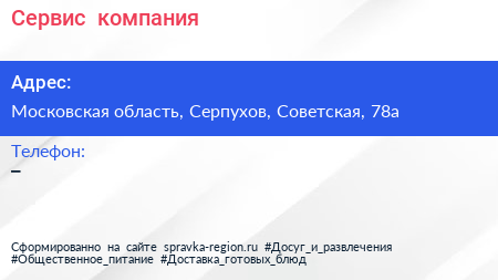 Сервис+, компания по адресу Московская область, Серпухов, Советская, 78а в дальнейшем Организация, размещена в следующих категориях: