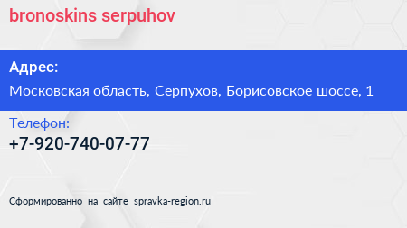 bronoskins.serpuhov по адресу Московская область, Серпухов, Борисовское шоссе, 1 в дальнейшем Организация, размещена в следующих категориях: