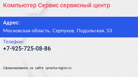 Компьютер Сервис, сервисный центр по адресу Московская область, Серпухов, Подольская, 53 в дальнейшем Организация, размещена в следующих категориях: