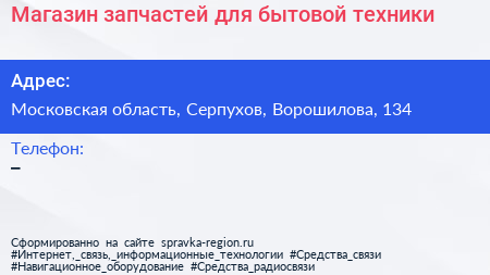 Магазин запчастей для бытовой техники по адресу Московская область, Серпухов, Ворошилова, 134 в дальнейшем Организация, размещена в следующих категориях: