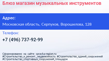 Блюз, магазин музыкальных инструментов по адресу Московская область, Серпухов, Ворошилова, 128 в дальнейшем Организация, размещена в следующих категориях: