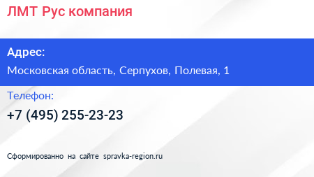 ЛМТ Рус, компания по адресу Московская область, Серпухов, Полевая, 1 в дальнейшем Организация, размещена в следующих категориях: