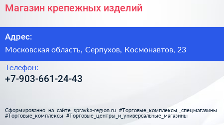 Магазин крепежных изделий по адресу Московская область, Серпухов, Космонавтов, 23 в дальнейшем Организация, размещена в следующих категориях: