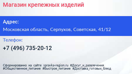 Магазин крепежных изделий по адресу Московская область, Серпухов, Советская, 41/12 в дальнейшем Организация, размещена в следующих категориях: