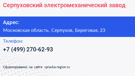 Серпуховский электромеханический завод по адресу Московская область, Серпухов, Береговая, 23 в дальнейшем Организация, размещена в следующих категориях:
