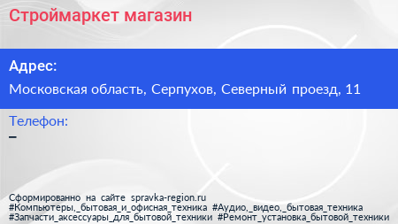 Строймаркет, магазин по адресу Московская область, Серпухов, Северный проезд, 11 в дальнейшем Организация, размещена в следующих категориях: