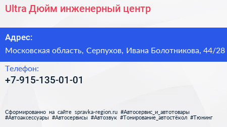 Ultra Дюйм, инженерный центр по адресу Московская область, Серпухов, Ивана Болотникова, 44/28 в дальнейшем Организация, размещена в следующих категориях: