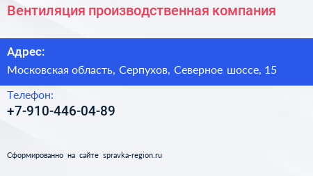 Вентиляция, производственная компания по адресу Московская область, Серпухов, Северное шоссе, 15 в дальнейшем Организация, размещена в следующих категориях: