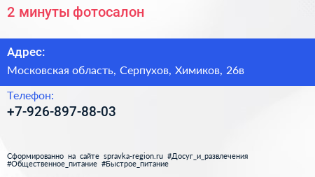 2 минуты, фотосалон по адресу Московская область, Серпухов, Химиков, 26в в дальнейшем Организация, размещена в следующих категориях: