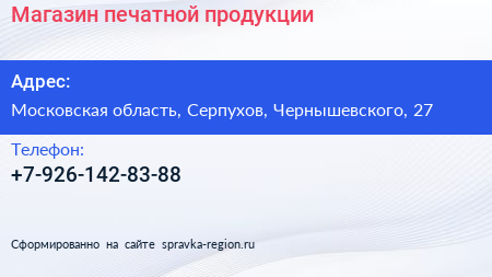 Магазин печатной продукции по адресу Московская область, Серпухов, Чернышевского, 27 в дальнейшем Организация, размещена в следующих категориях: