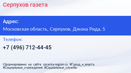 Серпухов, газета по адресу Московская область, Серпухов, Джона Рида, 5 в дальнейшем Организация, размещена в следующих категориях: