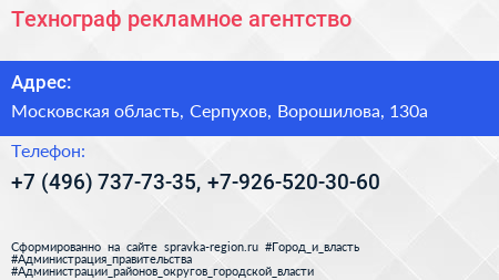 Технограф, рекламное агентство по адресу Московская область, Серпухов, Ворошилова, 130а в дальнейшем Организация, размещена в следующих категориях: