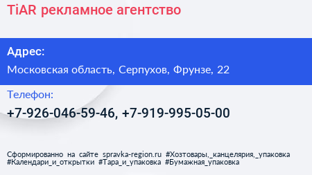 TiAR, рекламное агентство по адресу Московская область, Серпухов, Фрунзе, 22 в дальнейшем Организация, размещена в следующих категориях: