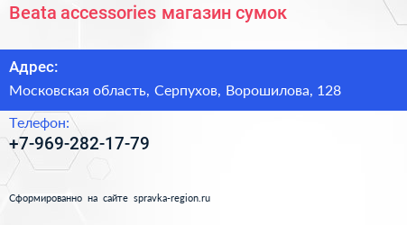 Beata accessories, магазин сумок по адресу Московская область, Серпухов, Ворошилова, 128 в дальнейшем Организация, размещена в следующих категориях: