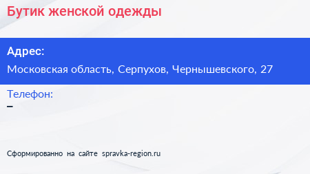 Бутик женской одежды по адресу Московская область, Серпухов, Чернышевского, 27 в дальнейшем Организация, размещена в следующих категориях: