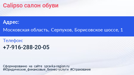 Calipso, салон обуви по адресу Московская область, Серпухов, Борисовское шоссе, 1 в дальнейшем Организация, размещена в следующих категориях: