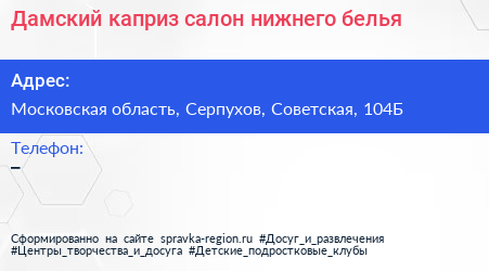 Дамский каприз, салон нижнего белья по адресу Московская область, Серпухов, Советская, 104Б в дальнейшем Организация, размещена в следующих категориях: