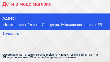 Дети в моде, магазин по адресу Московская область, Серпухов, Московское шоссе, 55 в дальнейшем Организация, размещена в следующих категориях: