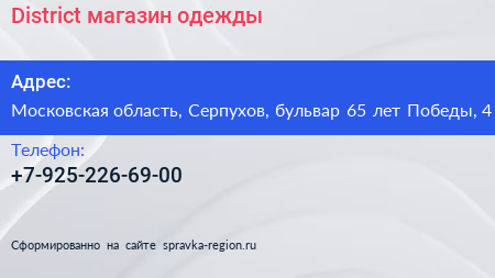 District, магазин одежды по адресу Московская область, Серпухов, бульвар 65 лет Победы, 4 в дальнейшем Организация, размещена в следующих категориях: