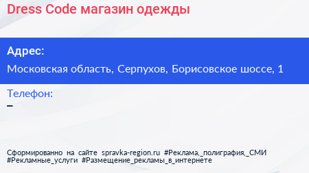 Dress Code, магазин одежды по адресу Московская область, Серпухов, Борисовское шоссе, 1 в дальнейшем Организация, размещена в следующих категориях: