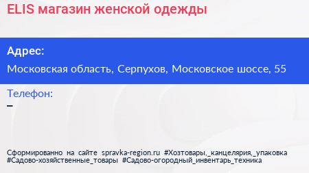 ELIS, магазин женской одежды по адресу Московская область, Серпухов, Московское шоссе, 55 в дальнейшем Организация, размещена в следующих категориях: