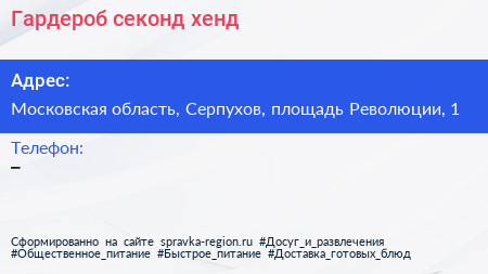 Гардероб, секонд-хенд по адресу Московская область, Серпухов, площадь Революции, 1 в дальнейшем Организация, размещена в следующих категориях: