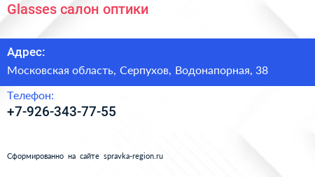 Glasses, салон оптики по адресу Московская область, Серпухов, Водонапорная, 38 в дальнейшем Организация, размещена в следующих категориях: