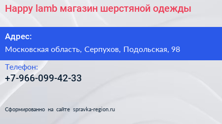 Happy lamb, магазин шерстяной одежды по адресу Московская область, Серпухов, Подольская, 98 в дальнейшем Организация, размещена в следующих категориях: