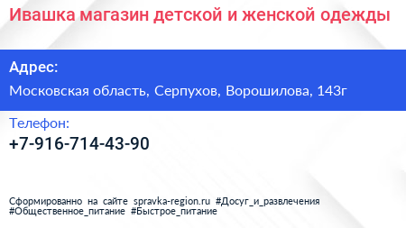Ивашка, магазин детской и женской одежды по адресу Московская область, Серпухов, Ворошилова, 143г в дальнейшем Организация, размещена в следующих категориях: