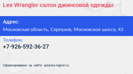 Lee Wrangler, салон джинсовой одежды по адресу Московская область, Серпухов, Московское шоссе, 43 в дальнейшем Организация, размещена в следующих категориях:
