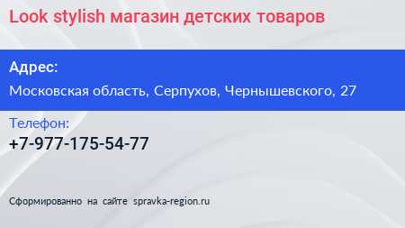Look stylish, магазин детских товаров по адресу Московская область, Серпухов, Чернышевского, 27 в дальнейшем Организация, размещена в следующих категориях: