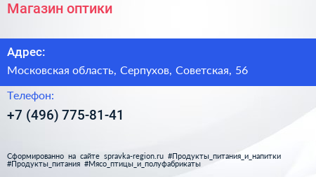 Магазин оптики по адресу Московская область, Серпухов, Советская, 56 в дальнейшем Организация, размещена в следующих категориях: