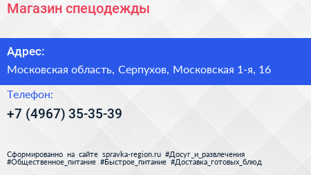 Магазин спецодежды по адресу Московская область, Серпухов, Московская 1-я, 16 в дальнейшем Организация, размещена в следующих категориях: