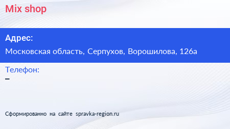 Mix shop по адресу Московская область, Серпухов, Ворошилова, 126а в дальнейшем Организация, размещена в следующих категориях: