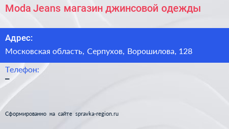 Moda Jeans, магазин джинсовой одежды по адресу Московская область, Серпухов, Ворошилова, 128 в дальнейшем Организация, размещена в следующих категориях: