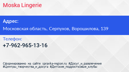 Moska Lingerie по адресу Московская область, Серпухов, Ворошилова, 139 в дальнейшем Организация, размещена в следующих категориях: