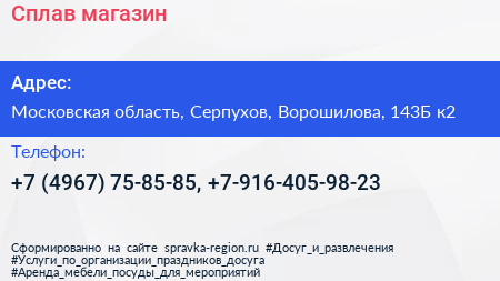 Сплав, магазин по адресу Московская область, Серпухов, Ворошилова, 143Б к2 в дальнейшем Организация, размещена в следующих категориях:
