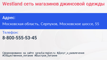 Westland, сеть магазинов джинсовой одежды по адресу Московская область, Серпухов, Московское шоссе, 55 в дальнейшем Организация, размещена в следующих категориях: