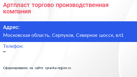 Артпласт, торгово-производственная компания по адресу Московская область, Серпухов, Северное шоссе, вл1 в дальнейшем Организация, размещена в следующих категориях:
