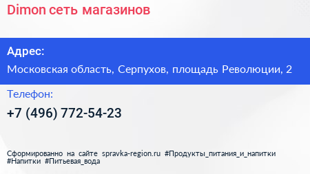 Dimon, сеть магазинов по адресу Московская область, Серпухов, площадь Революции, 2 в дальнейшем Организация, размещена в следующих категориях: